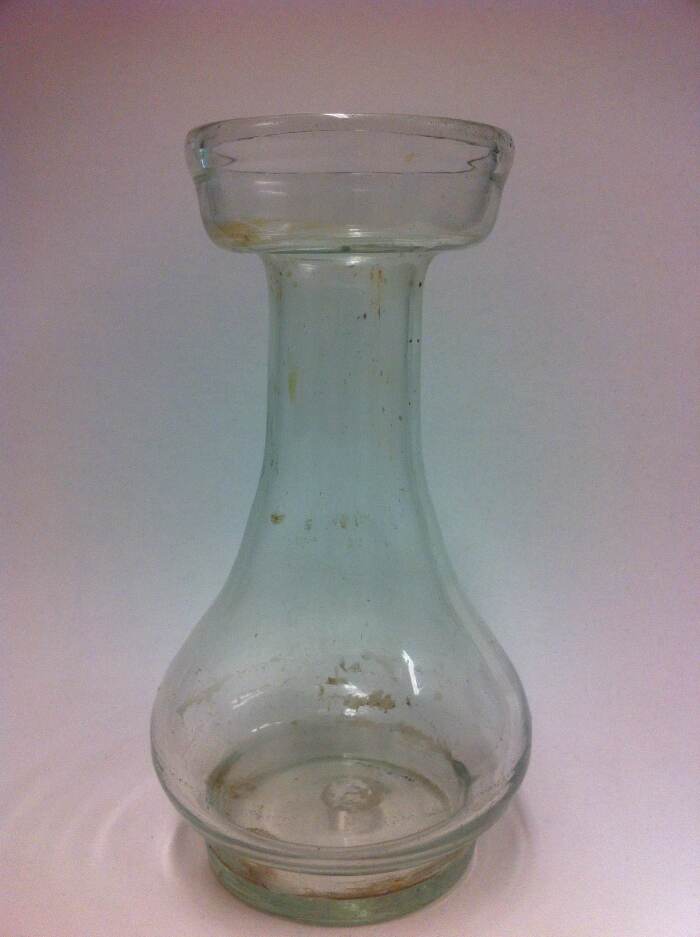 Vaso para bolbos em vidro incolor e transparente. Bojo largo de base plana, ombro comprido que afunila até o gargalo. Bocal largo e plano com bordo amplo. Contem a marca do pontel.