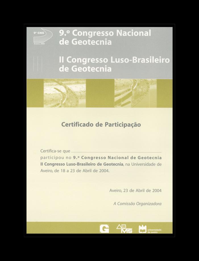 O 9.º Congresso Nacional de Geotecnia organizado por uma Comisão Organizadora, decorreu nos dias 16 a 23 de abril de 2004 na Universidade de Aveiro. No âmbito deste evento foram criadas duas peças gráficas, dois folhetos que são certificados de participação, um no Course in Geotechnical Risk in Rock Tunnels e outro no II Congresso Luso-Brasileiro de Geotecnia.