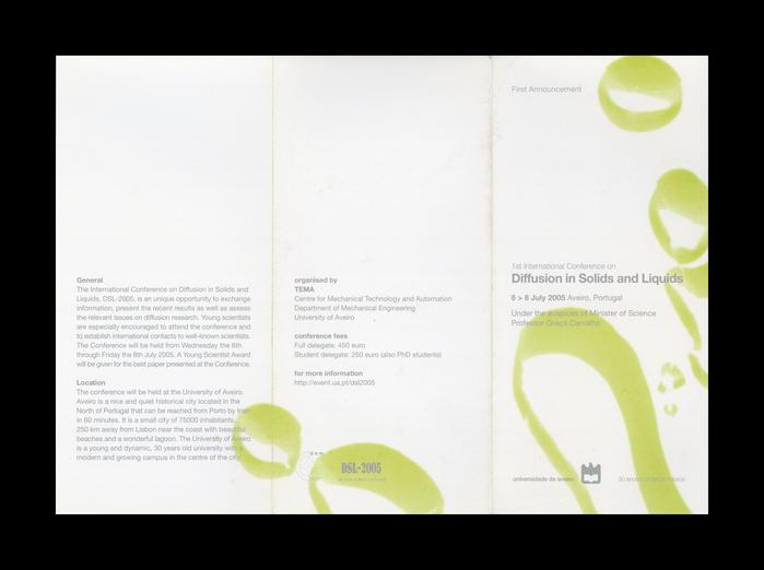 A 1st International Conference on Diffusion in Solids and Liquids organizada pelo Centre for Mechanical Technology and Automation (TEMA) do Departamento de Engenharia Mecânica da Universidade de Aveiro, decorreu nos dias 6 a 8 de julho de 2005 em Aveiro. No âmbito deste evento foi criada uma peça gráfica, um folheto desdobrável, que contém informações relativas ao evento e ainda uma ficha de inscrição destacável.