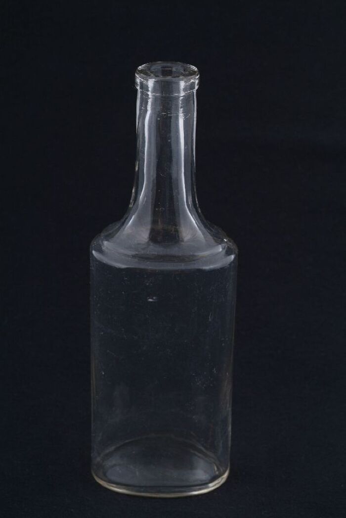 Frasco de base ovoide; ombros curvos e curtos; gargalo comprido e cilíndrico com bordo reto; Vidro transparente. Bojo cilíndrico e liso. Sem tampa