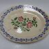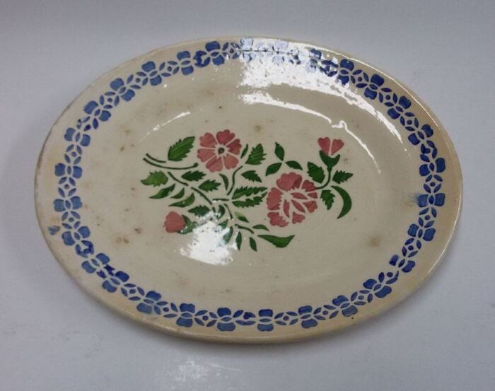 Peça moldada. Formato oval com decoração floral, aplicada através de técnica de estampilha: no fundo nas cores verde e rosa velho e na aba a azul cobalto.