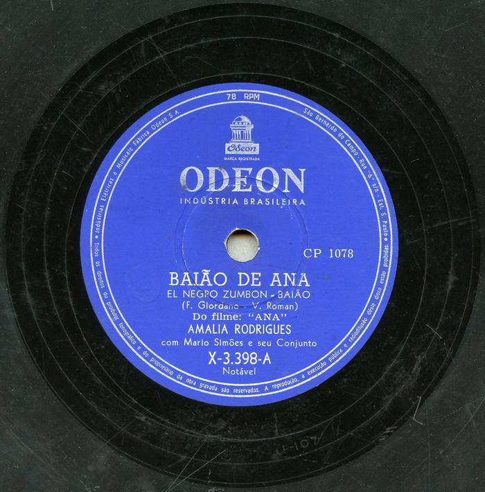 Disco de goma-laca, de gravação elétrica, composto pelos títulos: Baião de Ana - El Negro Zumbon - Baião [de] F. Giordano, V. Roman, do filme "Ana" [e interpretada por] Amália Rodrigues, com Mário Simões e seu conjunto; Sempre e sempre amor - T'ho Voluto Bene - Canção [de] D. J. Ferreira, P. G. Redi [e interpretada por] Amália Rodrigues, com Mário Simões e seu conjunto.