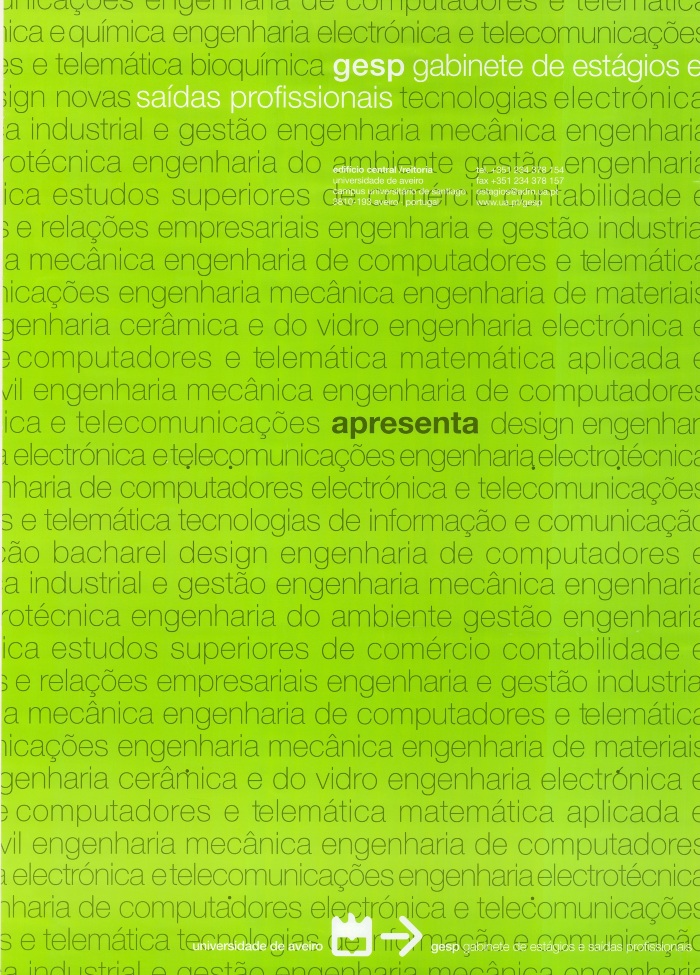 Este cartaz foi produzido pela Universidade de Aveiro, no ano de 1995 do século XX. O principal objetivo na elaboração do cartaz, foi promover e divulgar o GESP - Gabinete de Estágios e Saídas Profissionais, na orientação profissional dos estudantes/diplomados UA e no estabelecimento de relações entre a Universidade e as empresas.