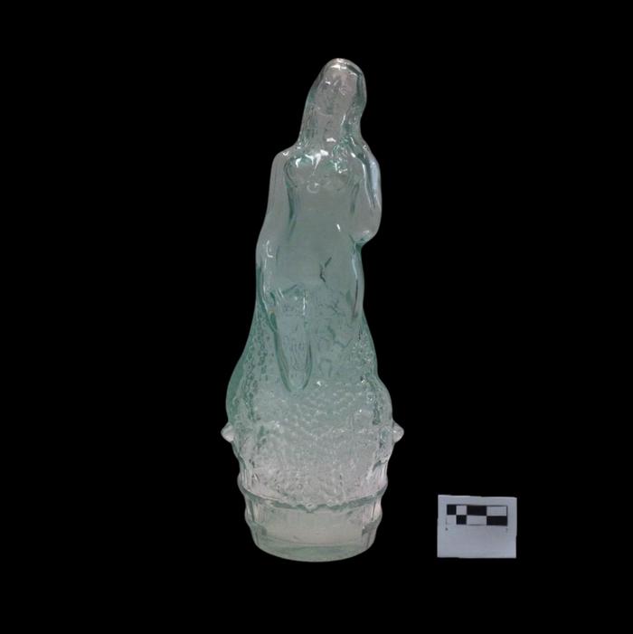 Anthorpomorphic bottle in the shape of Venus standing inside a basket filled with bunches of grapes.