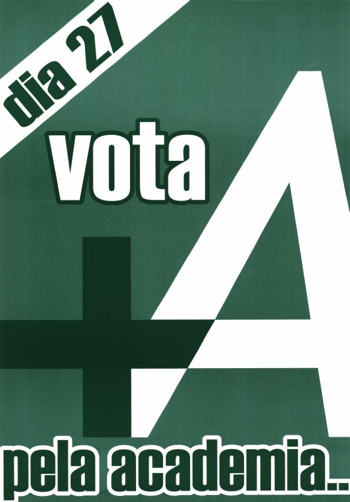 Cartaz criado com o objetivo de divulgar a candidatura da lista A à Associação Académica da Universidade de Aveiro, nas eleições de 2001. O cartaz faz parte integrante da coleção de cartazes da Universidade de Aveiro, encontrando-se a referida coleção no edifício da Biblioteca da UA.