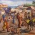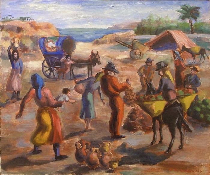 Feira de bens de subsistência, decorrida ao ar livre e sobre um piso árido em terra batida. Vendedores e compradores confundem-se na algazarra da cena, por onde se cruzam com mulheres que passam indiferentes ao negócio. Todas as pessoas são camponeses vestidos de fatos coloridos, enchapelados no caso dos homens e no caso das mulheres usando lenços na cabeça, aventais, saias abaixo do joelho, blusas abotoadas até ao pescoço e de mangas compridas.