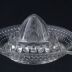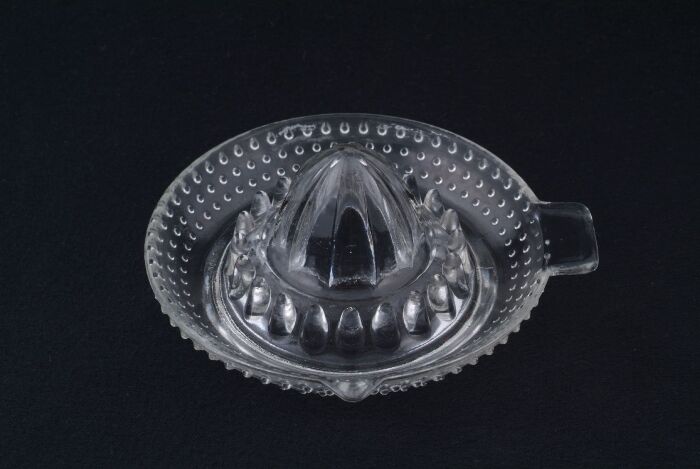 Peça de vidro transparente e incolor. Morfologia típica de um espremedor de citrinos.