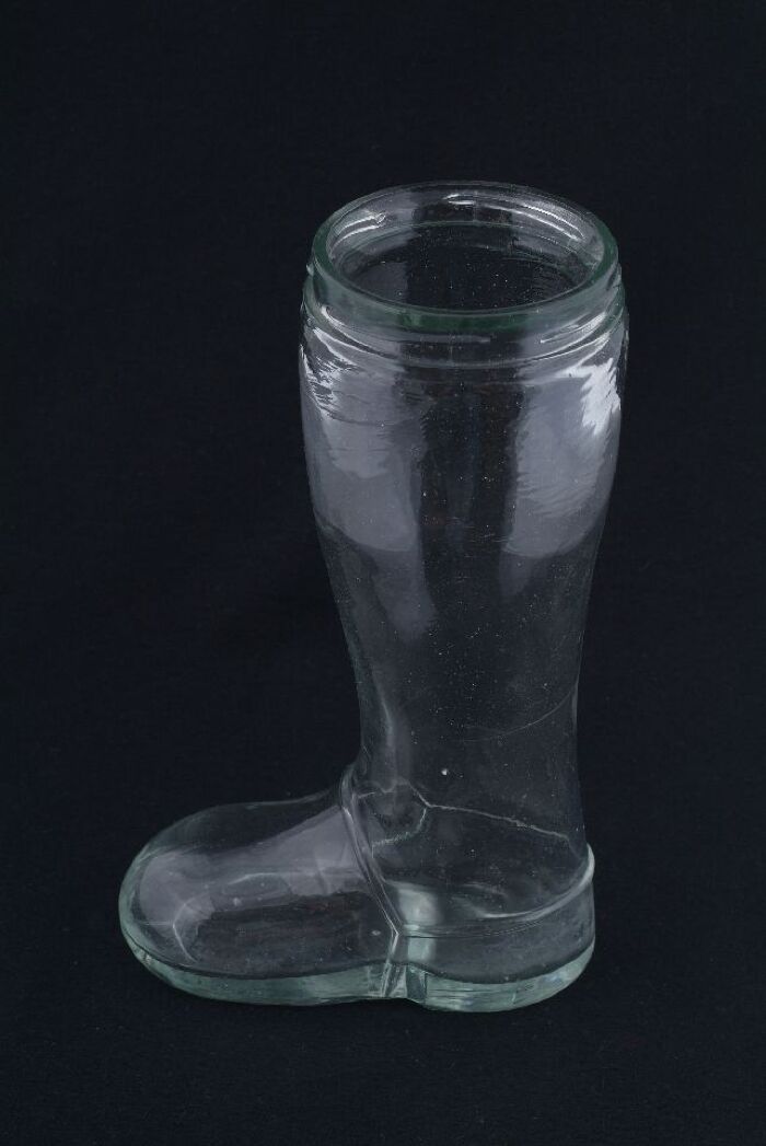 Frasco de boca larga, forma de bota. Falta a tampa.