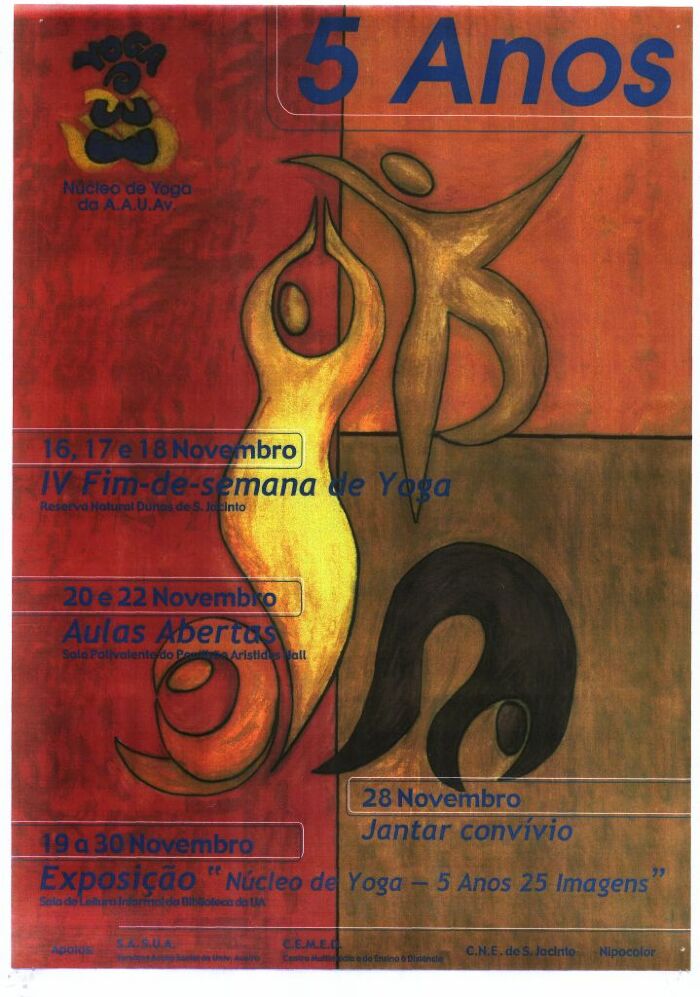 Este cartaz foi feito pela Universidade de Aveiro, para divulgar o evento "5 anos" que celebrou os 5 anos do Núcleo de Yoga nos dias 16, 17 e 18 de novembro de 2001. O cartaz faz parte integrante da coleção de cartazes da Universidade de Aveiro. A coleção encontra-se localizada no edifício da Biblioteca da Universidade de Aveiro.
